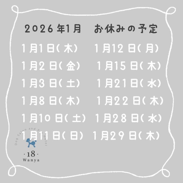 2026年1月のお休み予定 2025.11.02 2026年1月のお休み予定です🐶1月10日から12日は3連休ですが子供の地区行事のためお休みとさせていただきます🙇♀️ご迷惑をおかけしますがよろしくお願いいたします! カテゴリ 新着情報 ギャラリー 一覧を見る