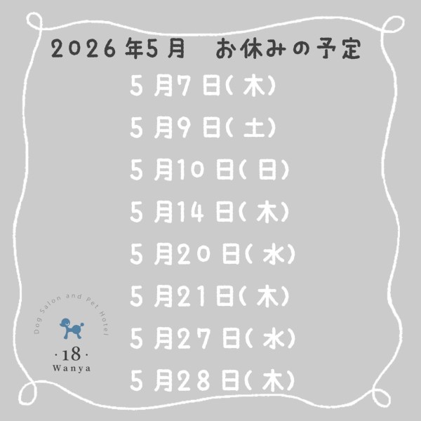 2026年5月のお休みの予定 2026.03.03 2026年5月のお休み予定です。遅くなりすみません🙇♀️土日のお休みは9日(土)、10日(日)となります。G.Wのお泊まりは5月1日からとなりますのでよろしくお願いいたします✨ カテゴリ 新着情報 ギャラリー 一覧を見る