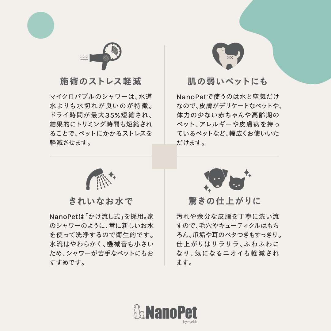 使うのは水と空気だけのバブルで大切なわんちゃんに負担をかけず、汚れや臭いをすっきり落としてふわふわつやつやに!